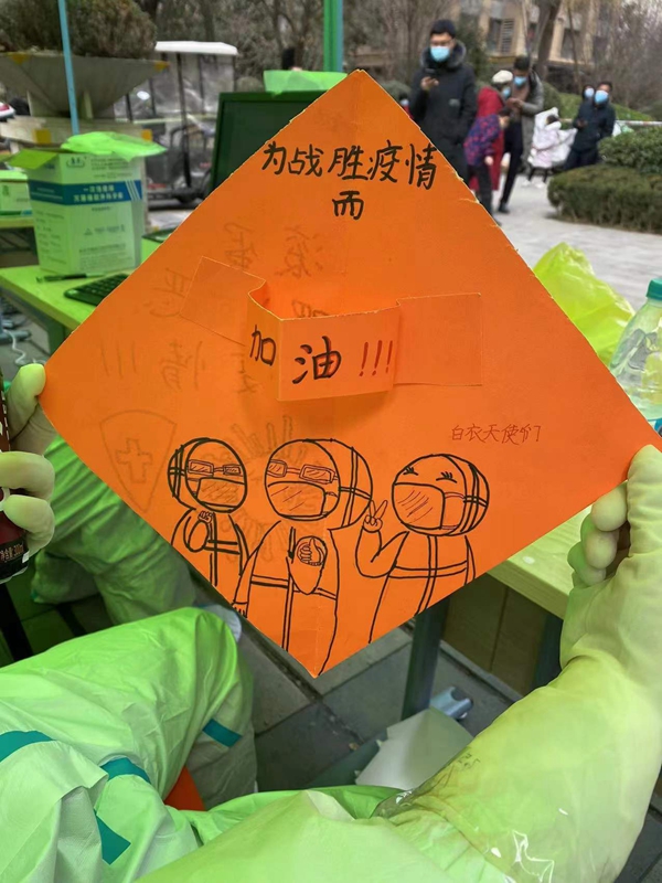 “這是小朋友送來(lái)的手工賀卡。因為每次做核酸的過(guò)程中,手上要不停噴酒精,做一個(gè)噴一,居民灌了好幾大桶熱水給我們暖手……”在郭杜街道書(shū)香路社區,配合完成5500位常駐居民核酸采樣的新型能源公司鄭智超,感動(dòng)地說(shuō):“能夠與這么一群優(yōu)秀的醫務(wù)工作者一起戰斗倍感榮幸,我會(huì )做好防疫工作,為我們共同熱愛(ài)的城市貢獻一份陜煤力量。”