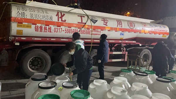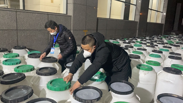 12月31日凌晨0點(diǎn)05分陜煤集團工作人員伴著(zhù)夜幕卸載消毒液。