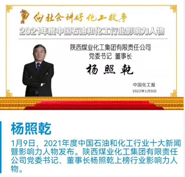 2022年1月9日,由中國石油和化學(xué)工業(yè)聯(lián)合會(huì )指導,《中國化工報》社有限公司主辦的“2021年度石油和化工行業(yè)十大新聞暨影響力人物發(fā)布盛典”采用線(xiàn)上直播的形式舉行。陜煤集團黨委書(shū)記、董事長(cháng)楊照乾榮膺“2021年度中國石油和化工行業(yè)影響力人物”。