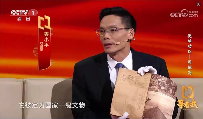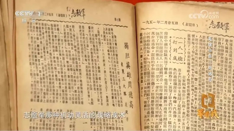 節目中,姜小平展示了他珍藏的1951年在朝鮮戰地出版的《志愿軍》報合訂本,該合訂本從創(chuàng )刊號到第四十期,被認定為國家一級文物。在1951年2月25日出版的《志愿軍》第八期中,《獨膽英雄周德高》一文介紹了周德高的英雄事跡。