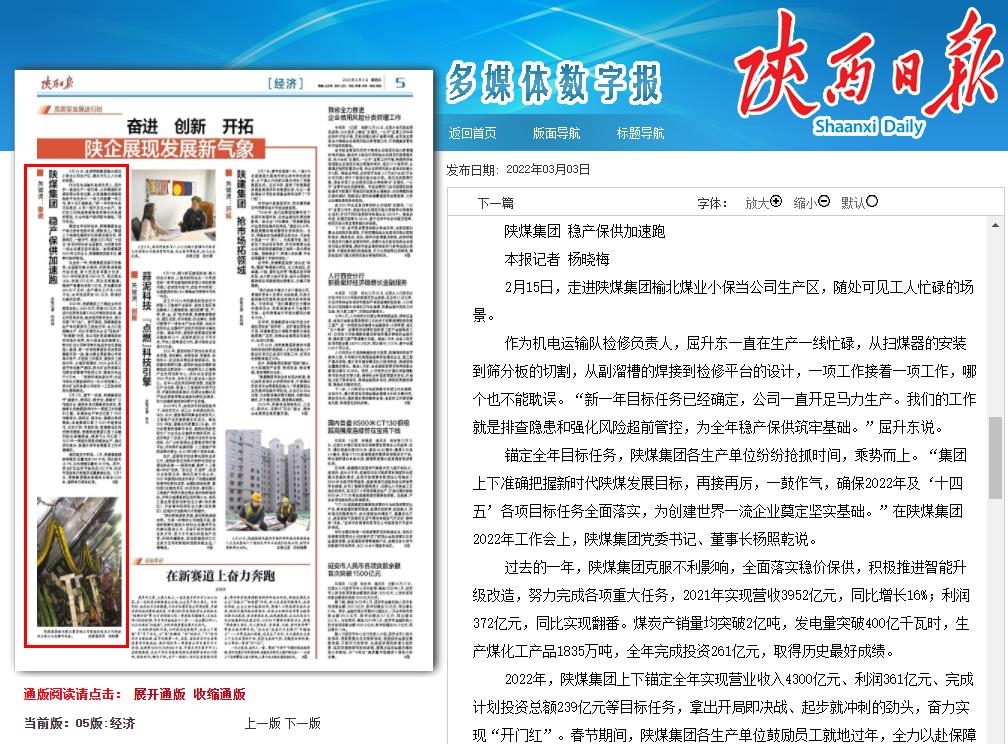 陜西日報 | 陜煤集團2021年利潤同比實(shí)現翻番