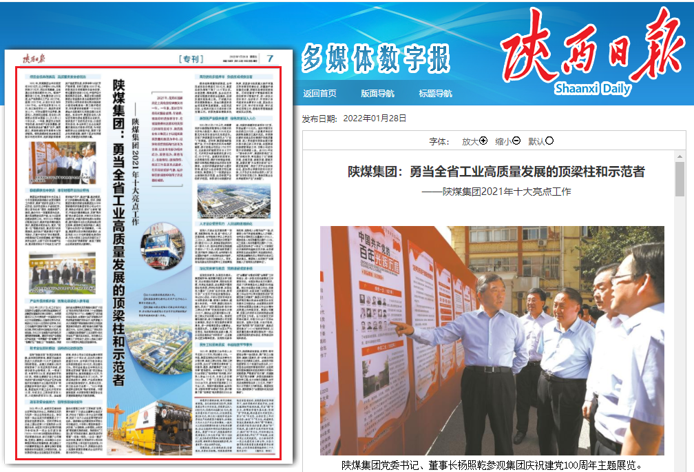 陜西日報2022年1月27日7版陜煤集團:勇當全省工業(yè)高質(zhì)量發(fā)展的頂梁柱和示范者——陜煤集團2021年十大亮點(diǎn)工作陜煤集團黨委書(shū)記、董事長(cháng)楊照乾參觀(guān)集團慶祝建黨100周年主題展覽。陜煤集團黨委副書(shū)記、總經(jīng)理嚴廣勞深入項目建設現場(chǎng)調研指導工作。陜煤集團所屬的西安重裝集團涇渭新城20MWp分布式光伏項目。全力以赴做好煤炭保供工作。陜煤集團渭化彬州公司年產(chǎn)30萬(wàn)噸乙二醇項目現場(chǎng)全景。陜煤榆北煤業(yè)有限公司聯(lián)合西安科技大學(xué)、西安煤礦機械有限公司共同開(kāi)發(fā)研制的煤礦智能快速掘進(jìn)機器人系統。2021年,是黨和國家歷史上具有里程碑意義的一年...